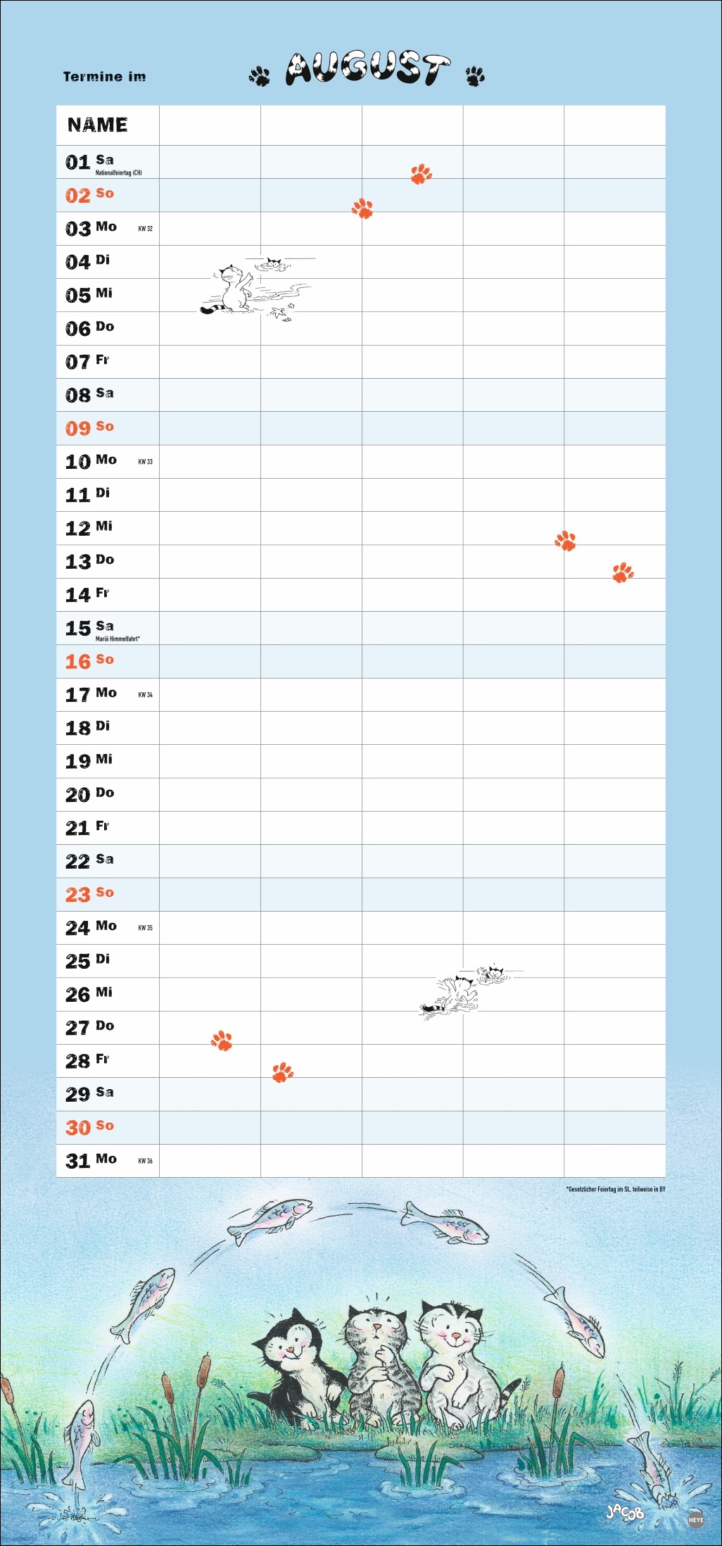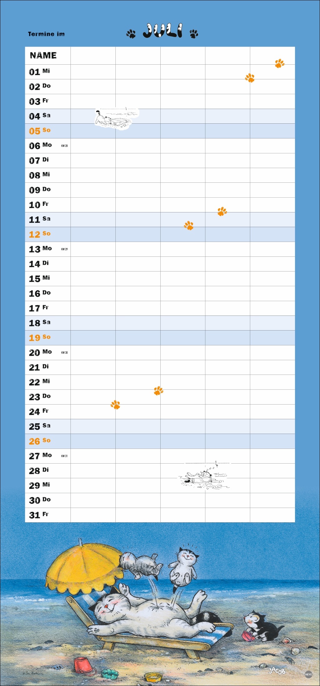 5 Spalten Platz für wichtige Termine, Ferien- und Freizeitaktivitäten